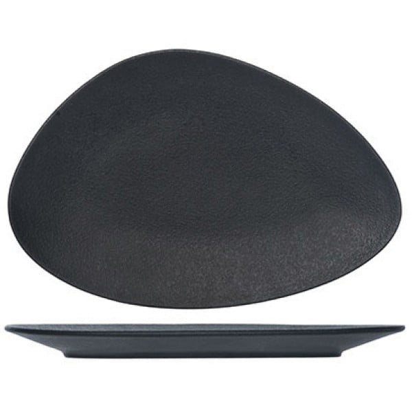 Πορσελάνινο πιάτο ρηχό, οργανικό σχήμα, 21×14 εκ , της σειράς Black Dazzle, σε μαύρο ματ χρώμα. Η σειρά της Black Dazzle αποτελείται από πιάτα σε μοντέρνα μινιμαλιστική γραμμή. Τα πιάτα της σειράς είναι φλατ σε μια μοντέρνα εκδοχή καθώς η μια πλευρά του πιάτου είναι ελαφρώς υπερυψωμένη. Ιδιαίτερη έμφαση στην εμφάνισή τους, δίνει η ανάγλυφη επιφάνειά τους η οποία σε συνδιασμό με το μαύρο χρώμα καθιστά τα πιάτα μοναδικά. Ιδανική επιλογή για χώρους εστίασης, όπως θεματικά εστιατόρια, για προσεγμένες και ιδιαίτερες παρουσιάσεις των μενού. Όλα τα είδη είναι κατασκευασμένα από vitrified πορσελάνη, ιδιαίτερα ανθεκτική στις θραύσεις, κατάλληλα για επαγγελματική χρήση.