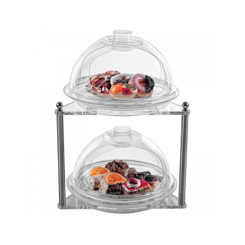 Διπλό stand παρουσίασης με ανοξείδωτη βάση και 2 σετ δίσκοι καλύμματα στρογγυλά διάφανα